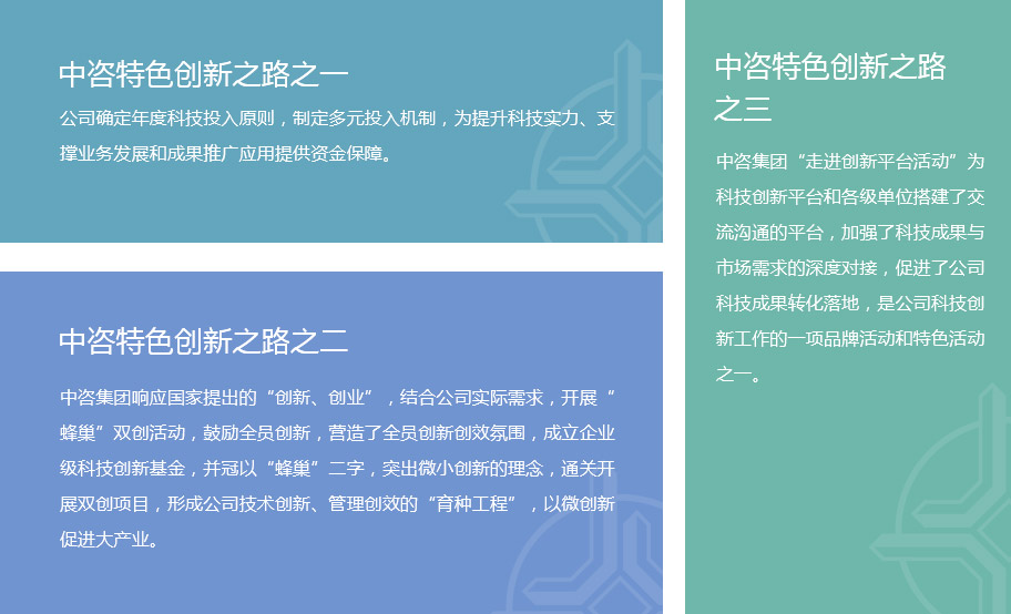 中咨集團(tuán)秉承“追求卓越、敢為人先”的創(chuàng)新精神,堅(jiān)持科技創(chuàng)新和科技體制改革雙輪驅(qū)動(dòng),建立了五位一體,上下聯(lián)動(dòng)的,具有中咨特色的技術(shù)創(chuàng)新體系。